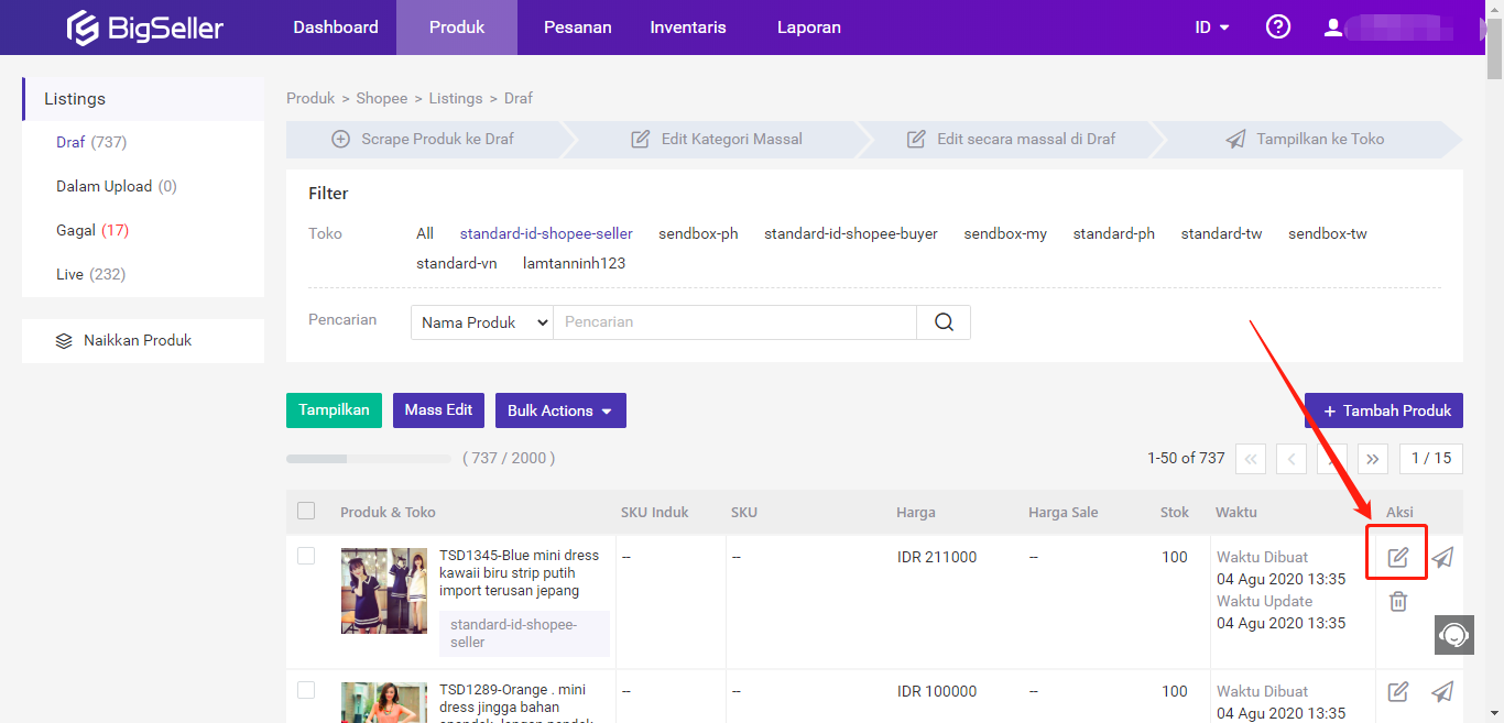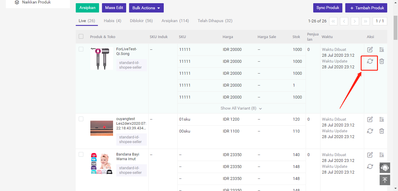 Catatan: Sebelum mengedit produk yang sudah diupload ke toko, silakan klik tombol Sync Produk untuk memperbarui informasi produk terbaru.