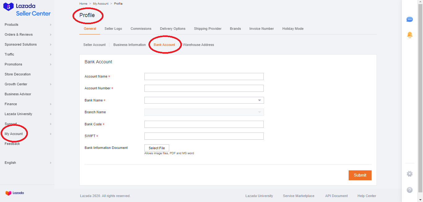 9. After adding in your stock, put in your bank account details so that you would get paid for every sale that you make. It can be found under My Account > Profile > General > Bank Account. Refer to the image below to be guided accordingly.