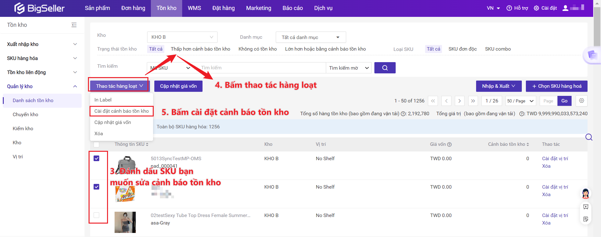 - Cảnh báo khi tồn kho chạm ngưỡng