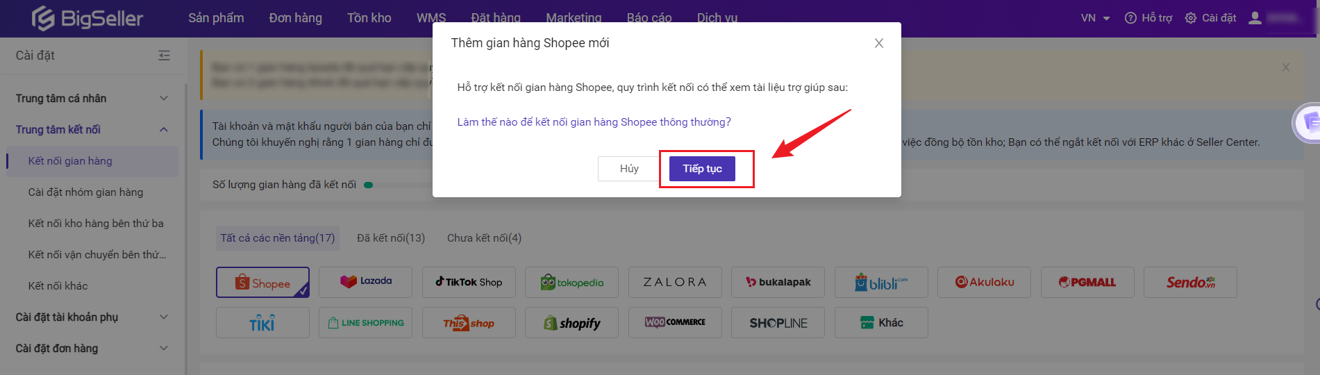 Vào mục Cài đặt > Kết nối gian hàng > Bấm biểu tượng Shopee> Bấm + Thêm gian hàng > Nhấp vào Tiếp tục, bạn sẽ vào trang kết nối Shopee, xem chi tiết kết nối gian hàng Shopee.