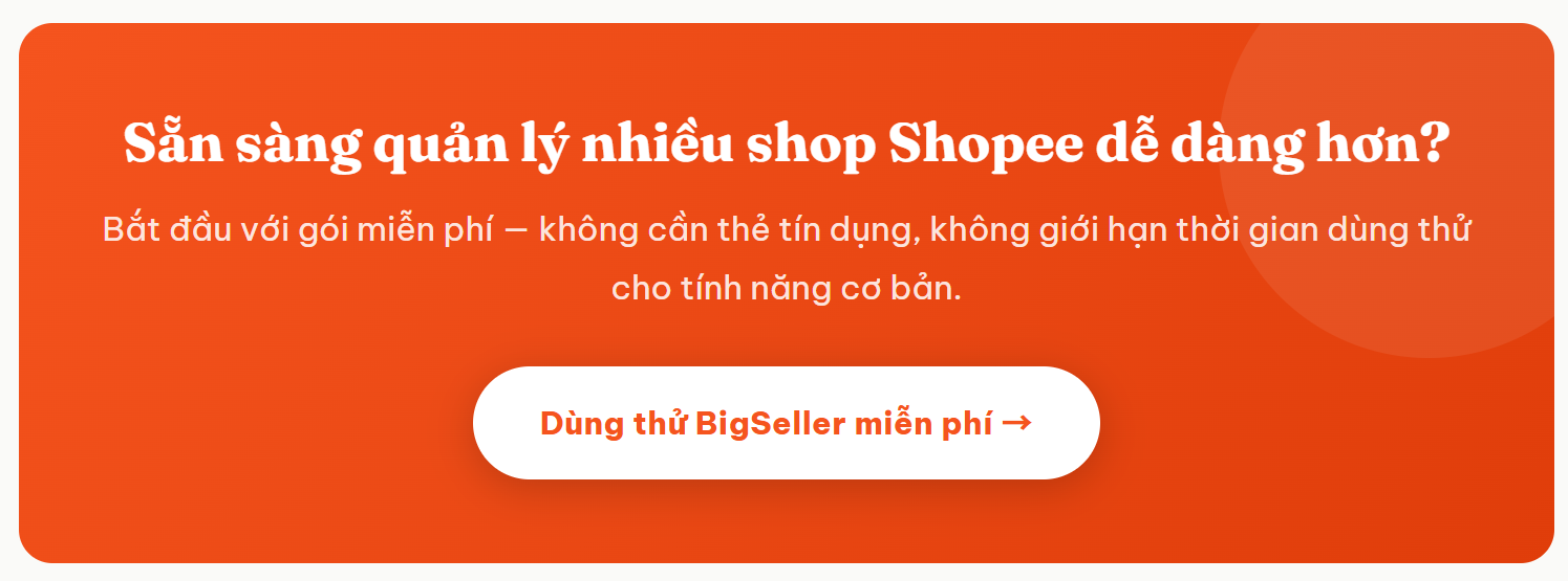 Quản lý nhiều shop Shopee không còn là cơn ác mộng khi bạn có BigSeller. Một giao diện duy nhất thay thế hàng chục tab trình duyệt, đồng bộ tồn kho thời gian thực thay thế Excel dễ lỗi, xử lý đơn hàng loạt thay thế click từng đơn. Và chúng tôi tin rằng, sau khi dùng BigSeller để quản lý nhiều shop Shopee, bạn có thể tiết kiệm 60-80% thời gian, giảm 90% lỗi bán quá số lượng kho, tăng tốc vận hành khi quy mô tăng.