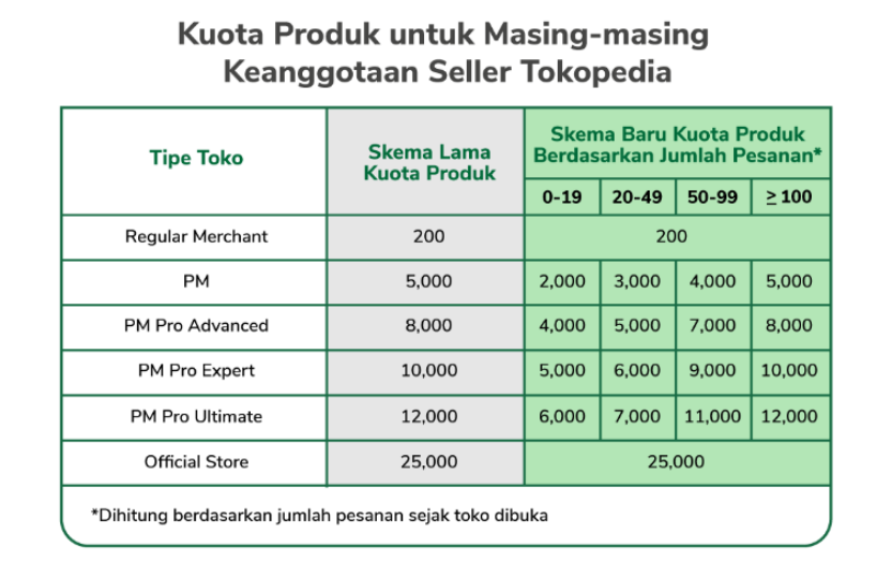 Baru-baru ini Tokopedia melakukan perubahan jumlah maksimal semua produk, jumlah maksimal produk diatur sesuai dengan keanggotaan Seller dan jumlah penjualan di Tokopedia, mulai dari tanggal 31 Agustus 2023 jumlah pesanan juga akan mempengaruhi jumlah produk yang dapat di upload. Untuk tipe toko Regular Merchant masih tetap sama sebanyak 200 produk, PM menjadi 2000 produk jika pesanan masih berada di 0-19 pesanan akan tetapi jika pesanan meningkat maka jumlah produk yang di upload juga akan semakin banyak.