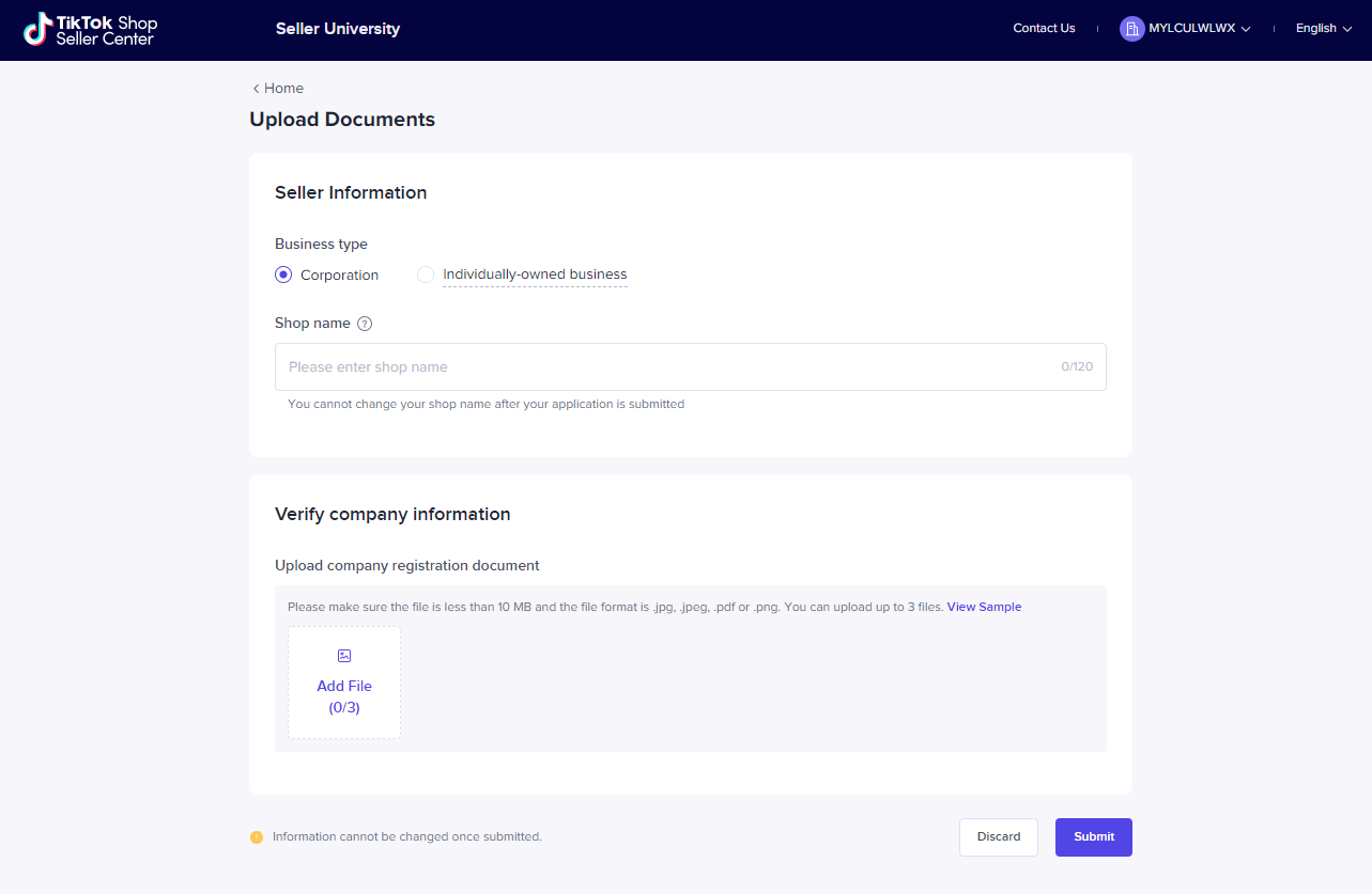 You need to upload documents to TikTok. For Business Type, you can select Corporation or Individually-owned business. If you select Corporation, you need to upload your company registration document. If you select Individually-owned business, you need to submit a valid Identity card or Passport and it must be issued by a relevant authority in Malaysia.