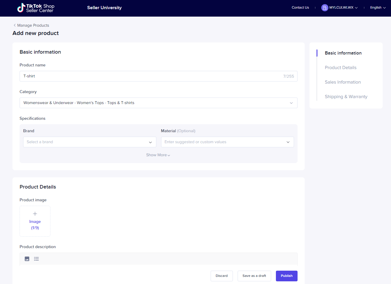 After that, you can fill in product information. The first is basic information, you need to enter your product name, select category, and fill in specifications. Next is product details, you can add up to 9 images, one video, and product description. You can also add variations and upload images for variation.
