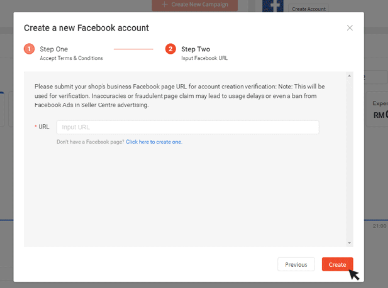 If you already have a Facebook business page, you can just copy the URL from the address bar and enter it into Shopee. After you click Create, your Facebook ads account will be created within 15 minutes.