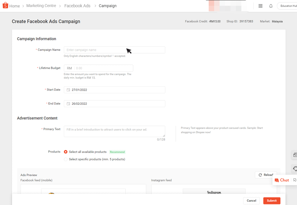 Go to "Shopee Seller Center" > "Marketing Center" > "Facebook Ads". Please note that this option is not accessible to every Shopee seller, so please contact the Shopee team to enable this feature first.