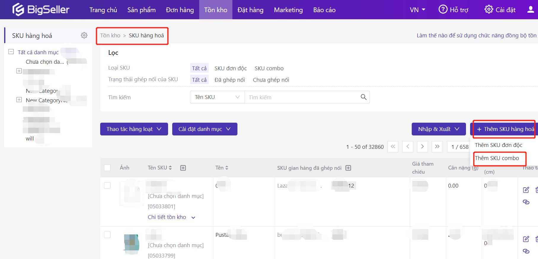 Tạo thủ công SKU hàng hóa có hai trường hợp, có thể tạo SKU đơn độc và tổ hợp SKU, tổ hợp SKU có thể hiểu như là SKU combo, SKU dạng này được áp dụng cho trường hợp combo khuyến mãi hoặc mua một tặng một. Bạn có thể tạo SKU combo và kiểm tra số lượng tồn kho thực tế có thể bán trên BigSeller.