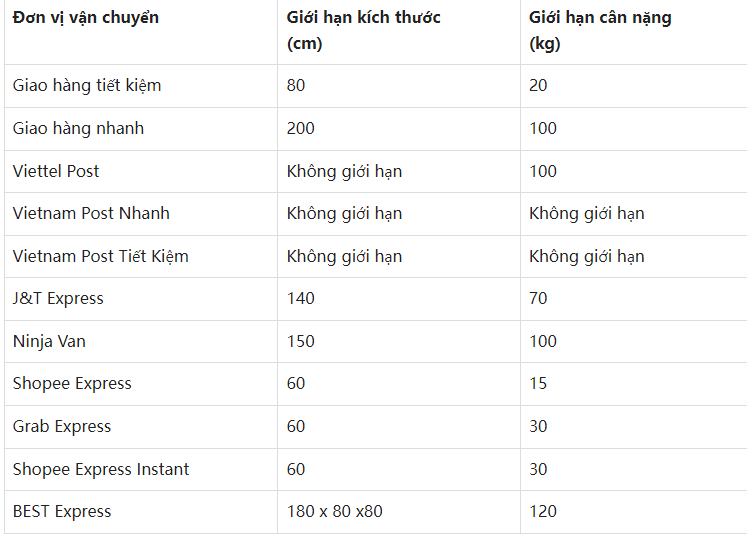 Bán hàng Shopee: Giới hạn kích thước và khối lượng hàng hóa của các đơn vị vận chuyển
