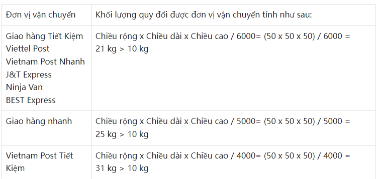 - Giới hạn khối lượng áp dụng cho cả khối lượng thực tế và khối lượng quy đổi của sản phẩm. Mỗi đơn vị vận chuyển sẽ có cách tính cân nặng quy đổi khác nhau.